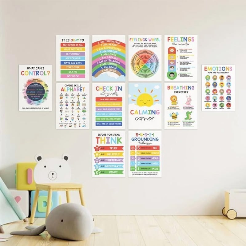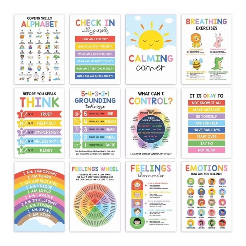 💡 Powerful Visual Aids: Includes a set of posters like an emotions chart, feelings poster, mood meter, and feeling wheel chart—all serving as powerful visual aids for emotional regulation.